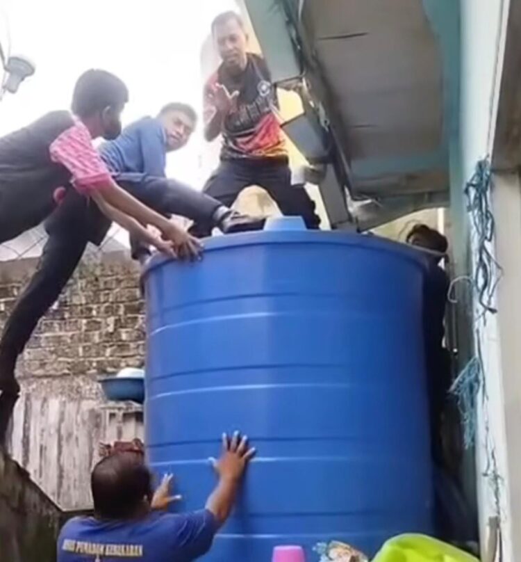 TERJEBAK : Petugas Damkar Nunukan saat mengevakuasi bocah 12 tahun yang terjebak di tangki air lantaran menyelamatkan kucing. (Dok. Disdamkar Nunukan)