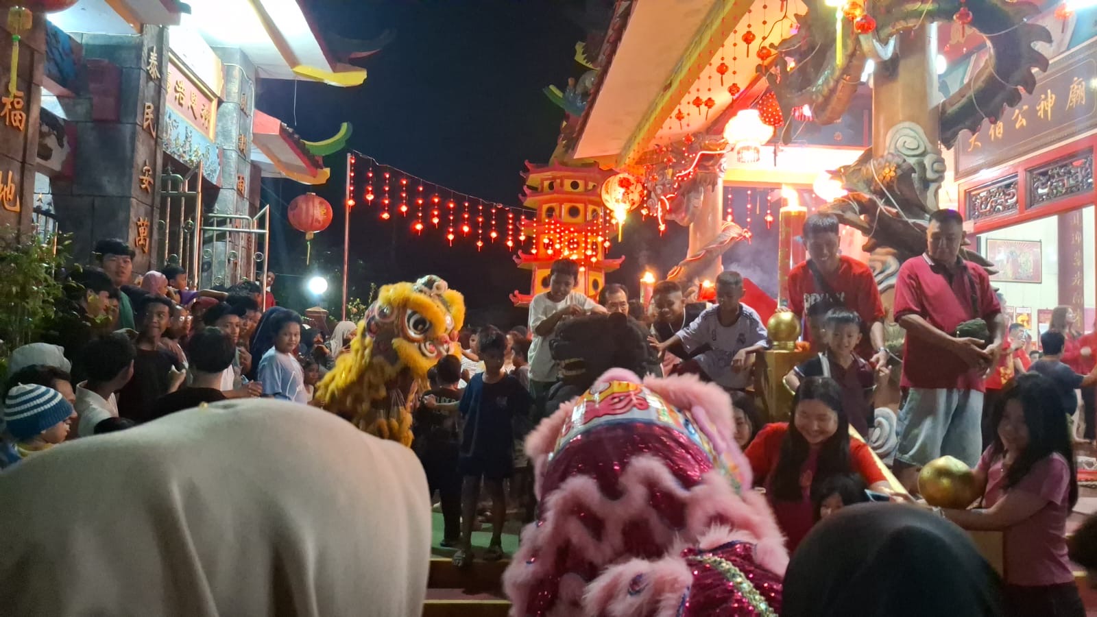 Sejak pukul 18.00 Wita, masyarakat sudah berdiri di depan klenteng menanti dentuman gendang dan kemunculan barongsai yang menjadi ikon setiap perayaan Tahun Baru Tionghoa. Suasana semakin semarak saat tabuhan musik tradisional mulai terdengar dan delapan ekor barongsai tampil bergantian.