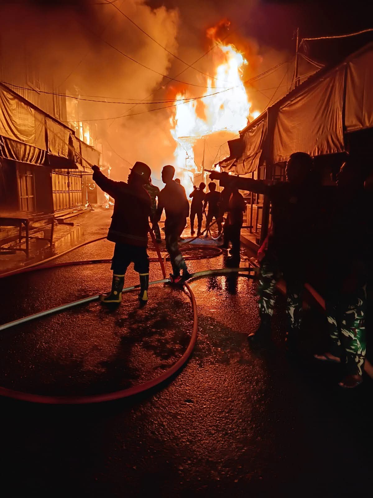 Api membakar rumah dan toko warga di Jalan Jalan Maramis RT 02, Desa Mansalong Kecamatan Lumbis, Minggu (14/8/2025).