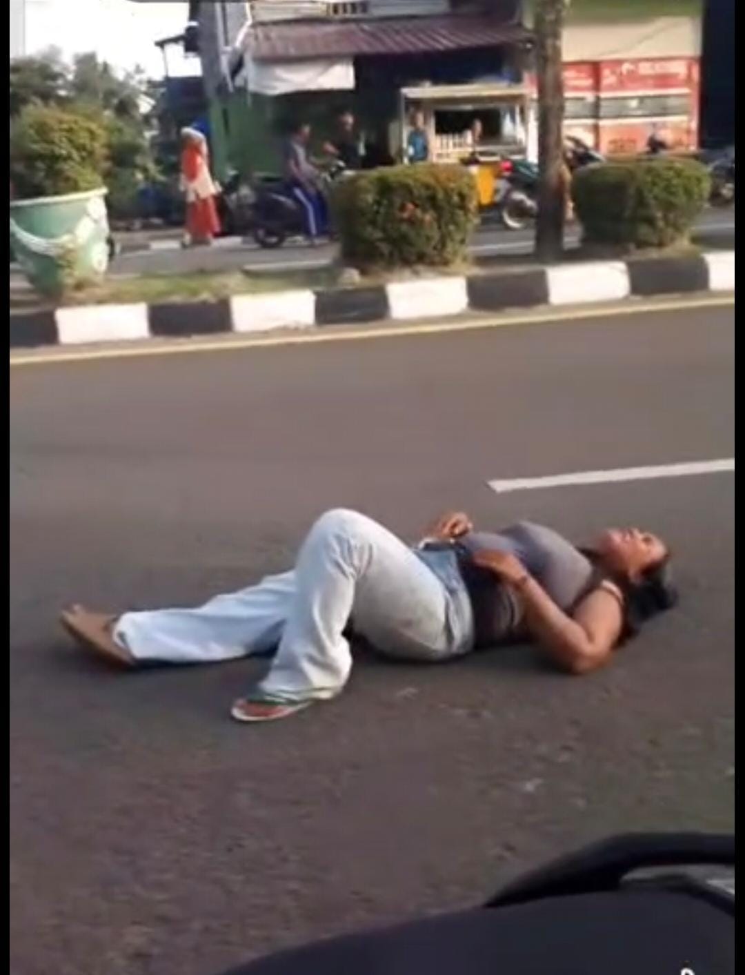 RESAHKAN : Aksi Sumi berbaring di jalan padat kendaraan membuat resah pengguna jalan dan warga sekitar.