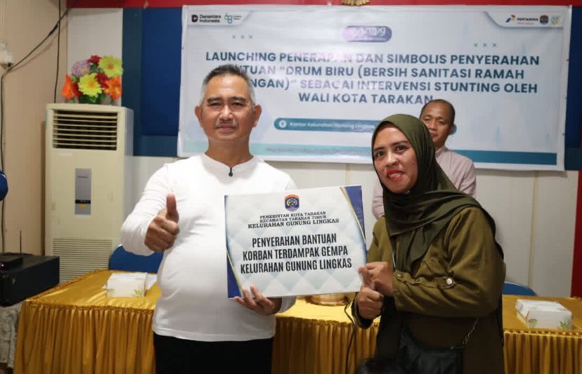 Tarakan- Wali Kota Tarakan, dr. H. Khairul, M.Kes, didampingi Ketua Tim Penggerak PKK Kota Tarakan Ny. Sitti Rujiah Khairul, S.Keb., Bdn, menghadiri sekaligus menyerahkan Bantuan Sanitasi Teknologi Tepat Guna (TTG) Drum Biru melalui Program CSR PT Pertamina Patra Niaga FT Tarakan. Kegiatan tersebut dirangkaikan dengan penyerahan bantuan kepada korban bencana gempa yang dilaksanakan di Kelurahan Gunung Lingkas, Jumat (13/2/2026).